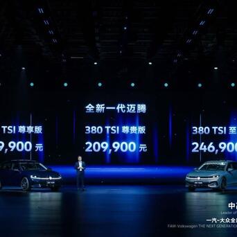【售17.99万元起 全新一汽-大众迈腾上市】7月9日,全新一代一汽-大众迈腾正式上市。新车共推出3款车型,售价区间为17.99-24.69万元。外观方面,新车采用全新家族设计风格,以“Timeless”为理念设计了IQ.LIGHT矩阵式大灯,内部灯带与前格栅灯带融为一体,中央的大众品牌LOGO可以点亮,并搭配两侧的贯穿式灯带。车身尺寸方面,新车长宽高分别为4990/1854/1487mm,轴距为2871mm。走入车内,新车采用简洁的内饰设计,主打干练实用,并增加了更多科技元素。另外,全新一代迈腾高配车型将配备15英寸中控大屏+11.6英寸副驾屏+10.25英寸液晶仪表三块屏幕。车辆还将配备8155芯片,中控屏分辨率为2240*1260(2K),并支持CarPlay/CarLife。动力方面,全新一代迈腾搭载了两套动力系统,分别为型号D5V的1.5T涡轮增压四缸发动机,最大功率为160马力(118kW),峰值扭矩250牛·米;以及型号为EA888-DTJ的2.0T涡轮增压四缸发动机,最大功率220马力(162kW),峰值扭矩350牛·米;传动系统均匹配7速湿式双离合变速箱,并提供经济、舒适、运动以及个性化四种驾驶模式。